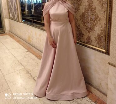 Zərif çəhrayı rəngdə, uzun, formal don. Parlaq, hamar parçadan