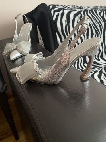 Gümüşü rəngdə qadın hündürdaban ayaqqabı. Ayaqqabının ucu sivri, dabanı isə xüsusi formalıdır. Ön hissəsində qeyri-şəffaf, bənzər rəngdə iri bant detalı var. Bağlaması toqqalı, arxa qayışlıdır. Zərif görünüşü ilə xüsusi tədbirlər üçün uyğundur.