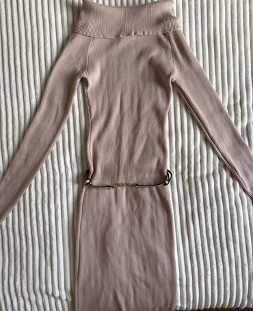 Zərif trikotaj qadın donu - Rəng: açıq pudra/çəhrayı - Material: elastik ribana trikotaj (şaquli rib teksturası) - Dizayn: beldən açılan ətək, plise effektli; uzun qollu, qol ucları yüngülcə geniş...
