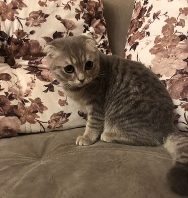 Şotland qıvrımqulaq (Scottish Fold) pişiyi - Rəng: Boz-gümüş tabby, yumşaq qısa tüklü - Qulaqlar: Klassik qıvrılmış, başa yaxın - Gözlər: Sarı-qızılı, ifadəli - Xüsusiyyətlər: Sakit və mehriban xa...