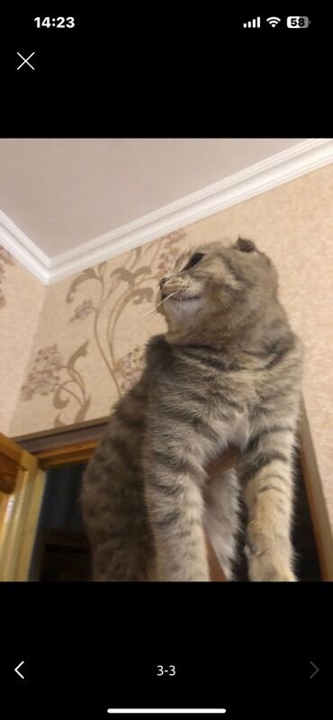 Şotland qıvrımqulaq (Scottish Fold) pişiyi - Rəng: gümüşü-boz tünd zolaqlı (tabby), bədən və qarında ləkəli/zolaqlı naxış - Qulaqlar: tipik “fold” – önə doğru qatlanmış - Gözlər: iri, kəhrəba rəng...