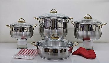 - Komplekt: 4 ədəd dərin qazan + 1 ədəd geniş tava/qazan, hamısı şüşə qapaqlıdır