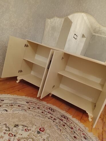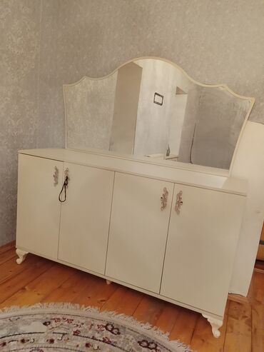 Termo makiyaj/komod dəsti - Material: ağ rəngdə termo örtüklü taxta səth, dekorativ qara haşiyələr - Komplekt: böyük düzbucaqlı güzgü + masa hissəsi - Saxlama: 2 qapılı şkaf bölməsi (sağ və sol), ...