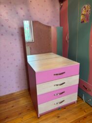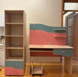 - Yazı masası: geniş iş səthi, arxa paneldə çəhrayı–mavi dalğavari dekor, 2 ədəd asma rəf, kabellər üçün dairəvi çıxış, klaviatura/aksesuar üçün sürüşən rəf, sağda çekmece. Altında təkərli kiçik stend (sistem bloku üçün uyğundur).