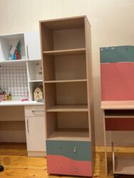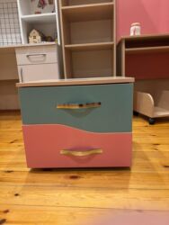 - Dərin rəfli şkaf: 3 açıq rəf və aşağıda 2 ədəd çekmece (çəhrayı–mavi önlüklər, dekorativ tutacaqlar).