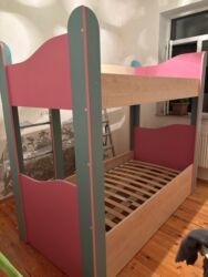 - İki mərtəbəli çarpayı: təbii ağac tonunda karkas, çəhrayı və mavi dekor panelləri. Yuxarı mərtəbə üçün qoruyucu yanlıqlar, metal nərdivan. Hər iki mərtəbə üçün lamelli əsas (matras daxil deyil).
