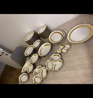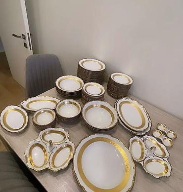 Çexiya istehsalı aq qızılı işlemelerle farfor 12 neferlik nahar dəsti.Uzerinde əlavə pridmetleride var.şekilde her biri açıq görunur.Tam təzə.