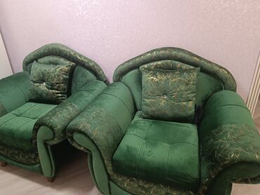 Yaşıl rəngli, naxışlı yumşaq mebel dəsti - Tərkibi: 1 ədəd uzun divan + 2 ədəd iri kreslo - Üzlük: tünd yaşıl fon üzərində krem-qızılı yarpaq və dolama naxışlar - Oturacaq və arxa hissə: yumşaq, dü...