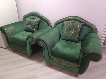Yaşıl rəngli yumşaq mebel dəsti – 1 ədəd üçlü divan və 2 ədəd iri kreslo. - Rəng: zümrüd-yaşıl, xırda naxışlı parça. - Komplekt: 3 nəfərlik divan + 2 ədəd eyni model kreslo. - Yumşaq, həcimli otur...