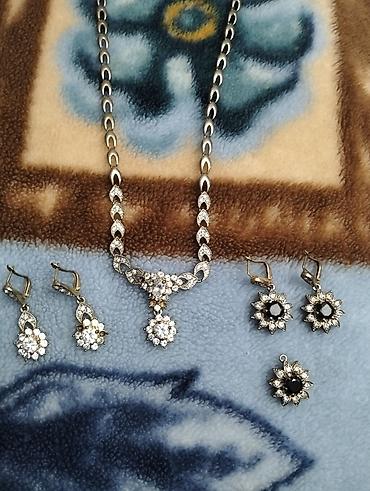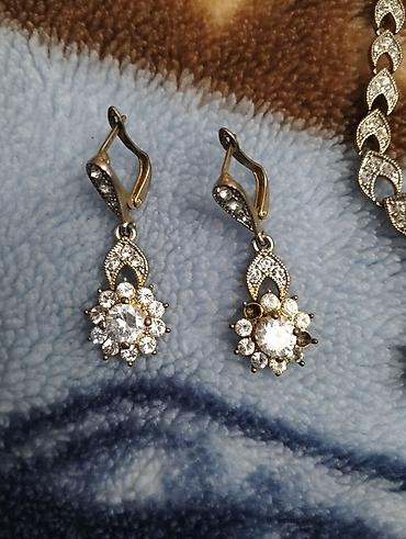 - Ağ daşlı sırğalar: damla formalı keçid, alt hissədə günəşşəkilli kompozisiya – ortada iri şəffaf daş, ətrafında xırda daşlar.