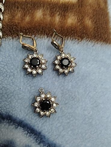 - Qara daşlı sırğalar: günəbaxan/rozetta motivi – ortada fasetli tünd daş, ləçəkvari çərçivədə parlaq ağ daşlar.
