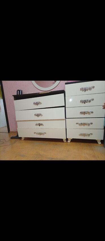 Ağ rəngli komod və dairəvi güzgü dəsti.İki ədəd şkaf iki ədəd tumba bir ədəd dairəvi güzgü .Reysləri çıxıb sadəcə.Təcili evdən çıxmalıdır remonta göre.