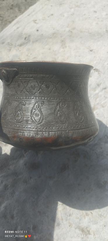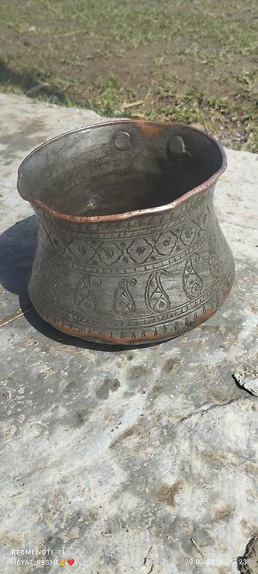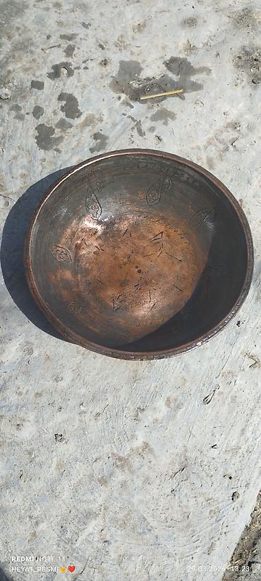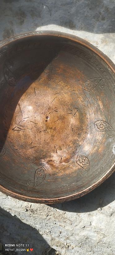 Misgərlik işi – əl oymalı mis qab - Material: döymə mis - Texnika: əl ilə oyma (naqişə), klassik Şərq üslublu bitki və floral motivlər - Səth işlənməsi: oksidlənmiş/“patina” effekti ilə tünd‑açıq ...