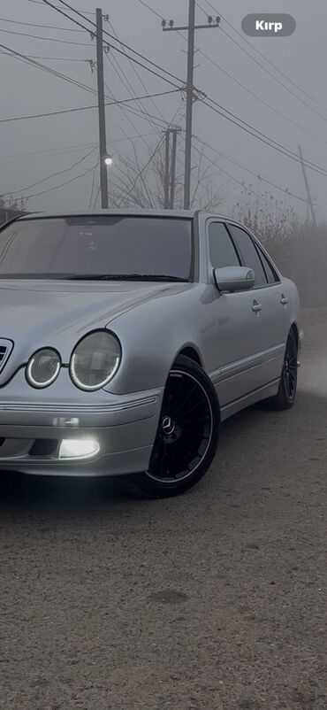 Mercedes-Benz E‑Class (W210) sedan - Kuzov: 4 qapılı sedan, tünd boz/smoke gray rəng - Mühərrik: benzin (ehtimal 2.0–2.8 l), ön mühərrik, arxa ötürücü: - Sürətlər qutusu: avtomat - Təkərlər/disklə...