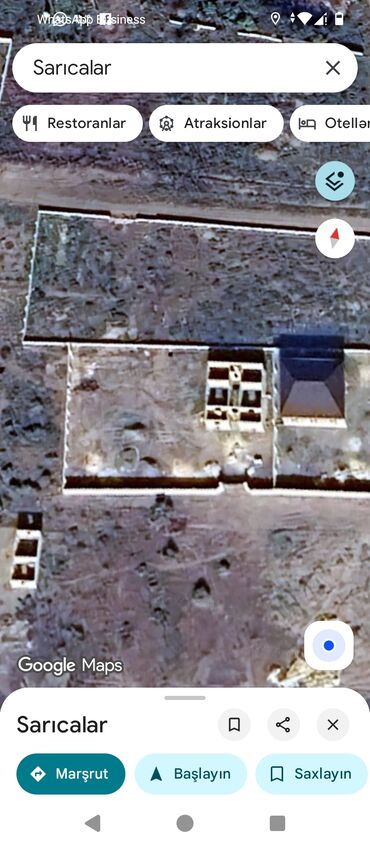 - Tikililər: Sahənin mərkəzinə yaxın hissədə mənzil planlı karkas/layihə əsasında yarımçıq tikili, ayrıca dam/örtülü konstruksiya. Yardımçı tikililər və bünövrə yerləri görünür.