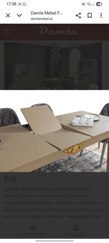 - Rəng və material: bej tonlarda korpus, qızılı dekorativ elementlər və ayaqlar; şüşə vitrin qapıları; parça üzlü rahat stullar.