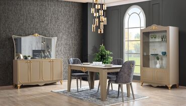 - Ölçü və istifadə: geniş masa ailə və qonaq qəbuluna uyğundur; vitrində qab-qacaq və dekor üçün şəffaf ekspozisiya sahəsi; komodda çoxsaylı bölmələr və rəflər; masa üstü hamar və asan təmizlənən səth.