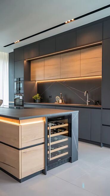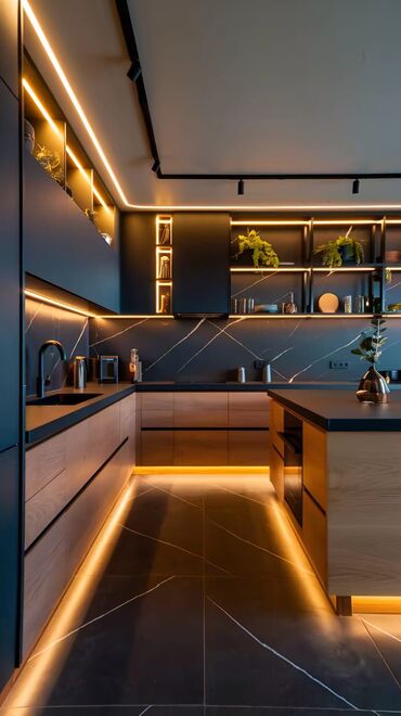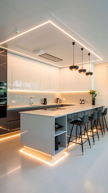 - Müasir mətbəxlər üçün inteqrasiya edilən LED işıqlandırma paketi: üst şkaf altı, arxa panel (backsplash) boyu xətti işıq, adanın/çekmecələrin baza hissəsi, açıq rəf içi nişlər və tavan konturu üçün.