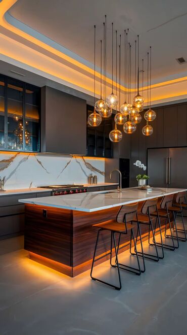 - Ada hissəsində bar oturacaqları üçün ayaqaltı işıq komfortu; şkaf altlarında döşəməni işıqlandıran yumşaq kontur.