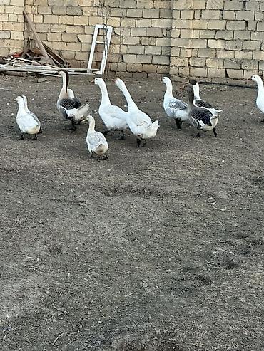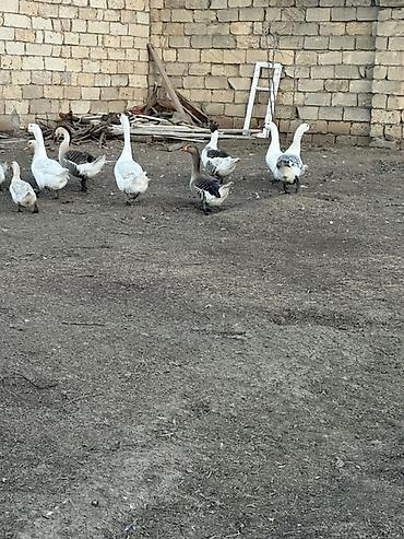 Qazlar – cütlük - Növ: ev qazı - Rəng: biri tam ağ, biri boz-ağ qarışıq - Say: 2 ədəd (cüt) - Gaga və pəncələr: narıncı - Xüsusiyyətlər: həyətdə sərbəst gəzintiyə öyrəşmiş, səsli xəbərdarlıq edən ...