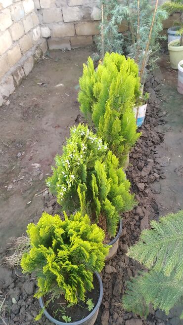 Məhsul: Thuja (qızıl rəngli, sütunvari ardıc) fidanları Xüsusiyyətlər: - Növlər: dekorativ qızılı-sarı və tünd-yaşıl məxməri iynəyarpaqlı sortlar - Hündürlük: təqribən 60–100 sm arası fidanlar - I...