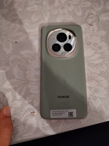 Honor smartfon ipone modelləri ilə bartel var - Model: Honor Magic5 Pro (şəkillərdəki dairəvi kamera modulu və ön ekran dizaynı ilə) - Rəng: Tünd boz/yaşıl ton - Ekran: Böyük, kənarlara doğru əyri...