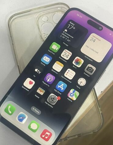 Məhsul: iPhone 14 Pro (qara/göy bənövşəyi temalı ekran), Dynamic Island dizaynı ilə. Xüsusiyyətlər: - 6.1" Super Retina XDR OLED ekran, Dynamic Island kəsiyi, Always‑On Display - A16 Bionic çipi –...