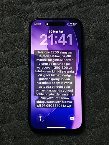 İphone 15 pro max 90 pil Zavoddu birdene cızığı yoxdu olsa 100 manat qiymetden çıxıram her çızığa göre İdeal telefondu ciddi marağlananlar əlaqə saxlasın öz telefonumdu kreditde deyil mağaza deyil ...