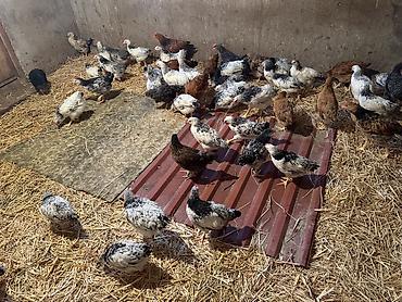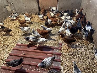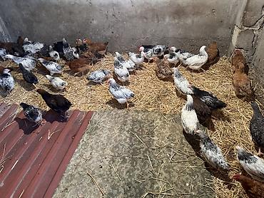 Qarışıq cins ev toyuqları və xoruzlar - Məhsul: həyət şəraitində saxlanılan qarışıq cins toyuqlar və bir neçə xoruz - Rəng və cins müxtəlifliyi: ağ, qara, qırmızı-qəhvəyi, ləkəli, boz və s. (yumur...