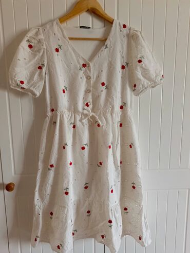 Ağ rəngli, broderiya (ağ iş) naxışlı yay donu Brend: Enter Ölçü: 38 (etiketdə) Xüsusiyyətlər: - Tam boyu boyunca çiçək naxışlı, deşikli broderiya parçadan - Köynək tipli yaxa - Ön hiss...