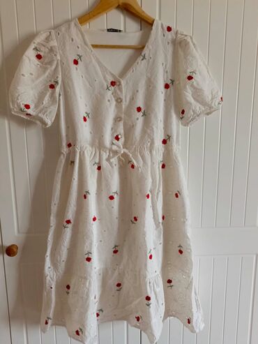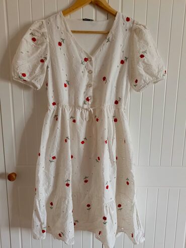 1 dəfə geyinilib Məhsul: Qadın paltarı - Rəng: Ağ fon, xırda mavi naxışlarla (giləmeyvə/çiçək motivləri) - Dizayn: Karpuz qol (şişirdilmiş qısa qollar), kvadrat yaxa - Bədən hissəsi: Elastik “smoc...