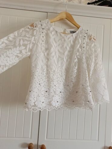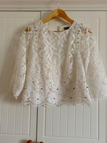 🌀Bluz: ağ rəng, floral krujeva naxışlı, incə muncuq/daş aplikasiyaları ilə. Dairəvi yaxa, 3/4 uzunluqda geniş qol. Omba hissəsinə qədər qısa kəsim, alt kənarı dalğalı krujeva bordür. Arxadan gizli fermuar bağlanma.