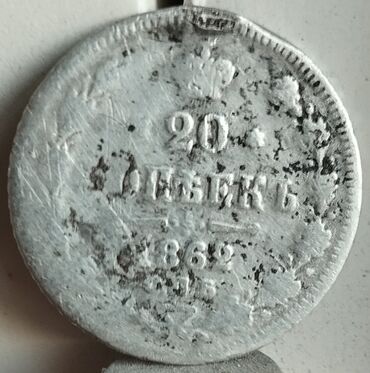 - Gümüşü rəngli köhnə sikkə: nominal “20”, kiril yazılı “КОПЕЕК” mətni görünür; aşağı hissədə “1869” ili oxunur, yuxarıda tac təsviri, kənarlarda bitki naxışları.