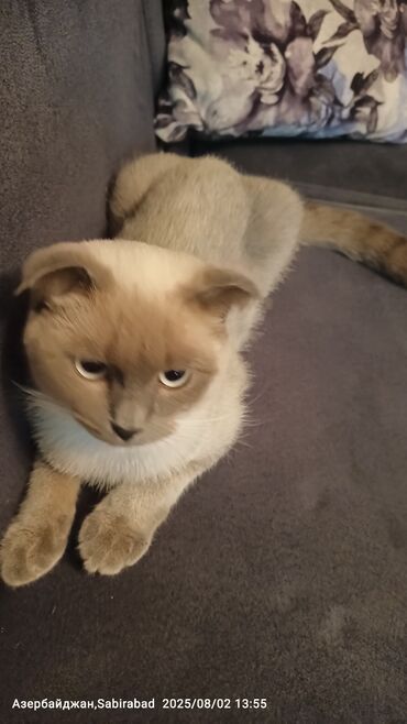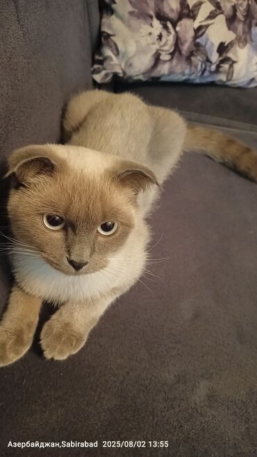 Scottish Fold tipli pişik Erkey 2yaş - Qısa, sıx tüklü, krem-qəhvəyi (siam tonlarında) rəng keçirilişi - Qıvrıq/qatlanan qulaqlar, dolğun yanaqlar, geniş baş forması - Sakit, ev şəraitinə uyğun xa...