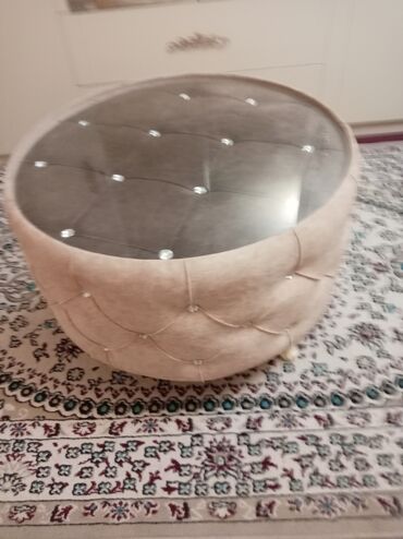 - Korpus: krem/bej rəngli yumşaq parça ilə döşənmiş, romb tikiş naxışlı, dairəvi forma.
