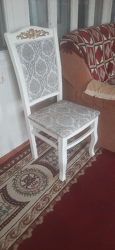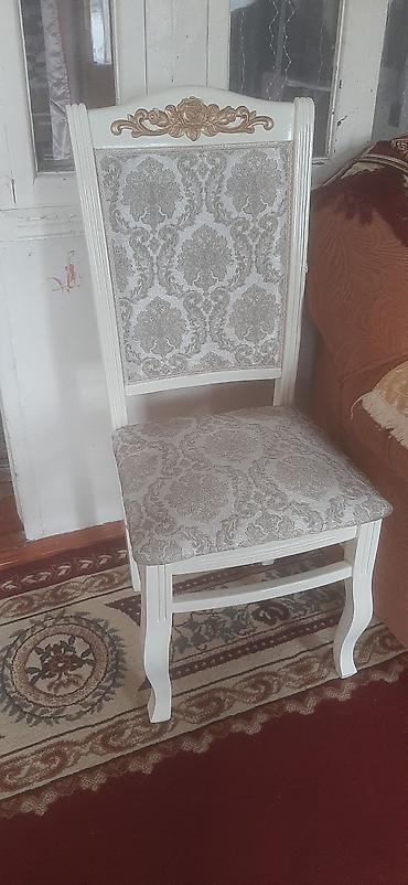- Stullar: Klassik üslubda, ağ karkaslı. Arxa söykənəcəkdə qızılı güllü dekor, üzərində bozumtul naxışlı parçadan yumşaq oturacaq və arxa hissə. Əyri formalı ayaqlar estetik görünüş və sabitlik verir.