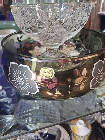- Bohemia Crystal (Made in Czechoslovakia) etiketli iri dekorativ şüşə kasa: çiçək və yarpaq motivləri ilə tünd qızılı-bürünc tonlarda.