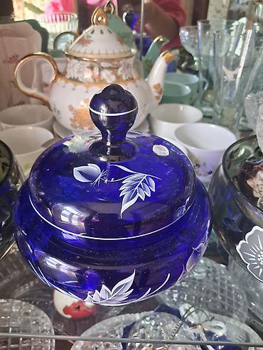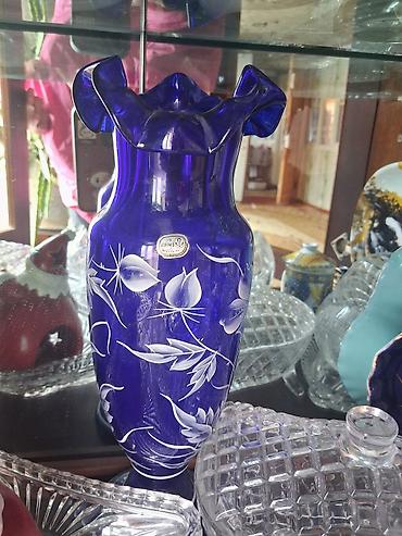 - Mavi kobalt rəngli şüşə vazalar və qablar: əl işləməsi ağ floral naxışlı, qalın şüşədən.