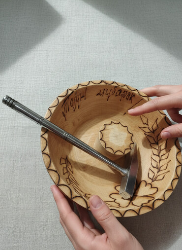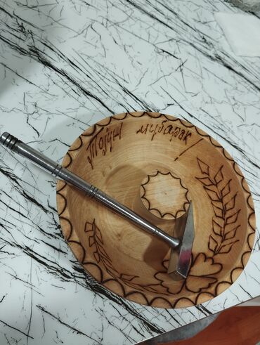 - Material: təbii ağacdan oyma dekorlu dəyirmi qab, üzərində naxış və “Qurban mübarək” yazısı yandırma texnikası ilə işlənib.