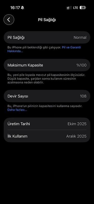 - Batareya: Sağlamlıq “Normal”, Maksimum tutum 100%, dövr sayı 108