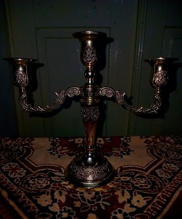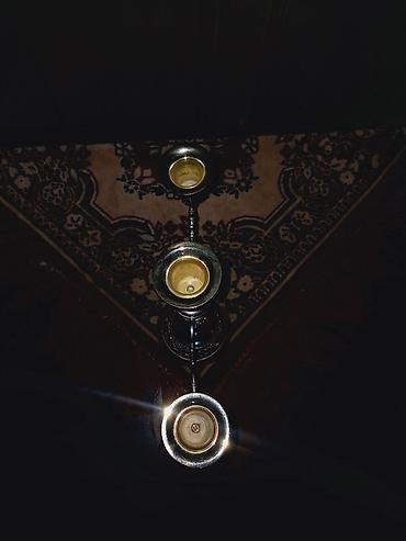 - Quruluş: mərkəzi dayaqlı, iki yan qol və bir üst başlıqla toplam 3 şam yuvası