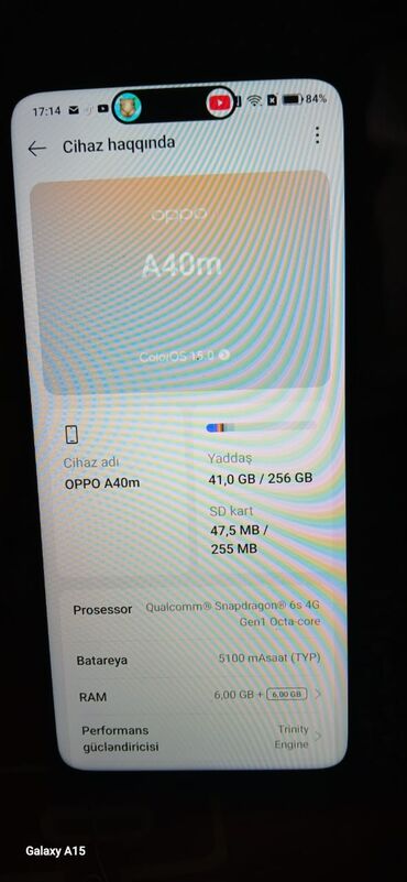 OPPO A40m smartfon Texniki xüsusiyyətlər: - Ekran: 6.67 düym - Sistem: ColorOS 15.0 - Prosessor: Qualcomm Snapdragon 6s 4G - Yaddaş: 256 GB daxili (55.5 GB istifadə olunub görsənir) - RAM: 6 GB + ...