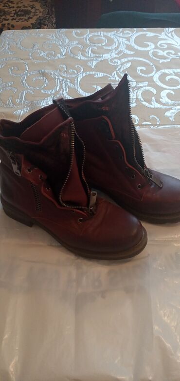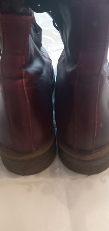 3) Bordo rəngli bağcıqlı yarımçəkmələr – yumşaq dəri üstlük, qalın rezin altlıq. İki tərəfli iri metal fermerlər və ön hissədə bağcığa yer (gözlüklər) var, dil hissəsi genişdir. Şəhər gəzintisi və rahat geyim üçün uyğun.