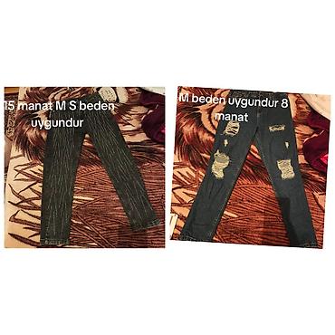 4) Qara dar cins şalvar – nazik işıltılı/çəkmə tikiş detallı, düz balaq. Ölçü: S-M uyğundur. Qiymət: 15 manat.