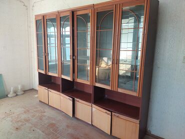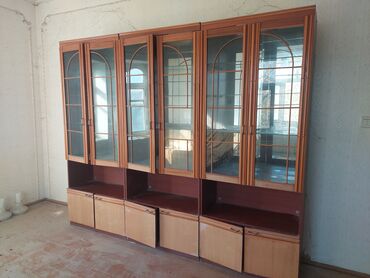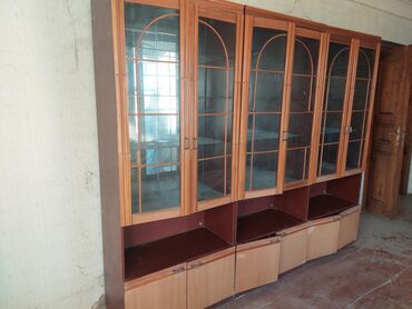 Məhsul: Taxta mebel dəsti və daxili qapılar - Divar boyu modul şkaf: 2 hissədən ibarət iri kompozisiya. Üst bölmələrdə dumanlı şüşəli vitrin qapıları, içəridə rəflər. Orta hissədə açıq niş sahələr...