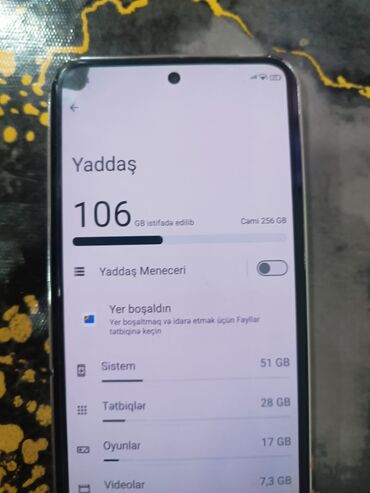 - Daxili yaddaş: 256 GB (şəkildə “Yaddaş Meneceri” ekranı görünür)
