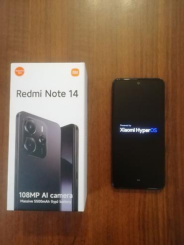 - Orijinal Redmi Note 14 qutusu (üzərində əsas xüsusiyyətlər: 108MP AI camera, Massive 5500mAh (typ) battery, Supports NFC)