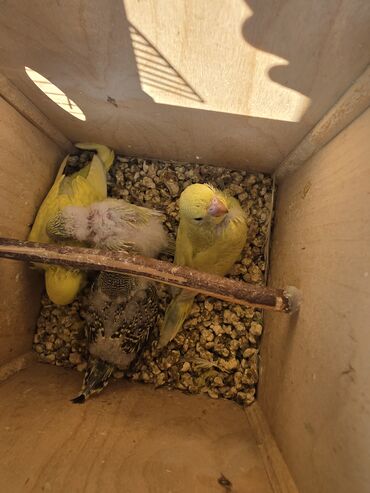 - Şəkillərdə görünən hər şey dəstə daxildir: qəfəs, yuvalama qutusu, taxta tüneklər, yelləncək, mineral daş, su və yem qabları, həmçinin balalar və valideyn quşlar.