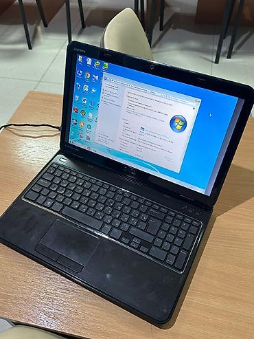 İş və təhsil üçün bazası güclü olan klassik 15.6" Dell noutbuk. Model etiketi və sistem məlumatları şəkillərdə göstərilib. Komplektə noutbuk və adapter daxildir.