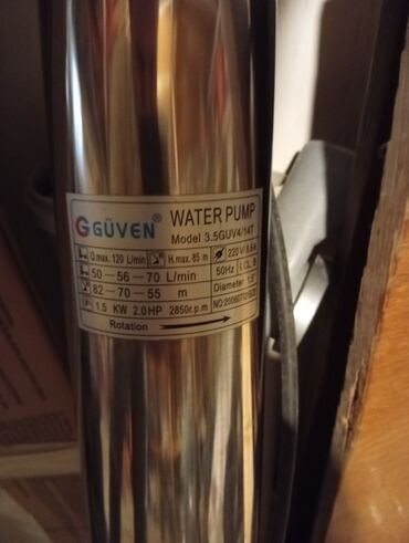 Güven markalı 3.5GUV4/14T model su nasosu, paslanmayan poladdan hazırlanmış silindrik korpusa malikdir. Yaşıl rəngli üst hissəsi ilə fərqlənir. Bu nasos maksimum 129 litr/dəqiqə su axını və 85 metrə qədər maksimal qaldırma qabiliyyəti təmin edir. 1.5 kW (2.0 HP) gücündə və 220V gərginliklə işləyən bu su nasosu, 1.5 düym diametrə malikdir və müxtəlif su təchizatı ehtiyacları üçün uyğundur. Məhsulun üzərində elektrik kabeli də mövcuddur.